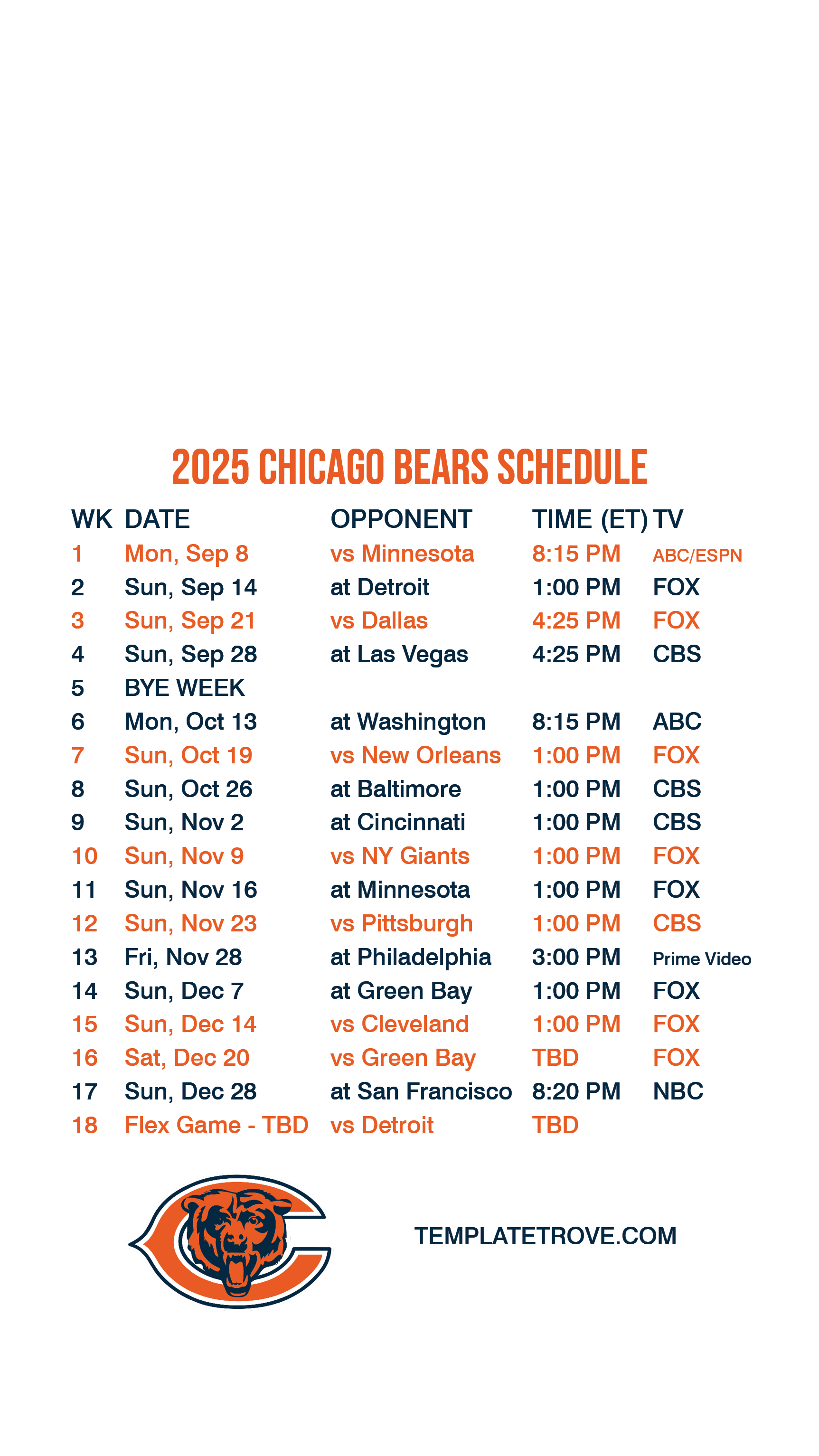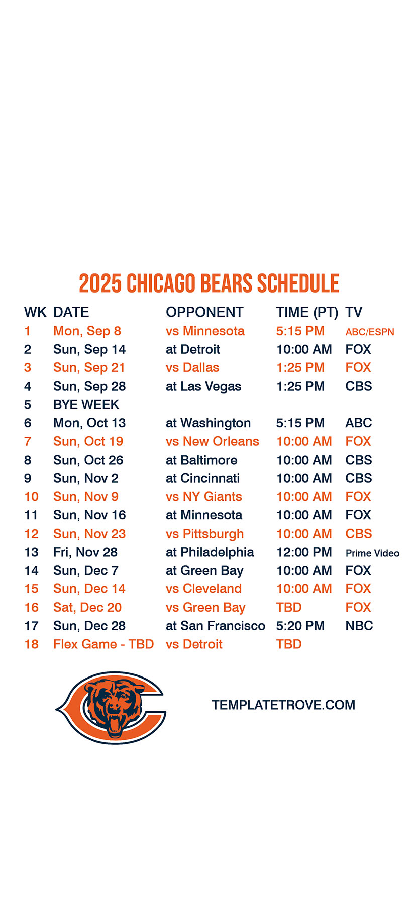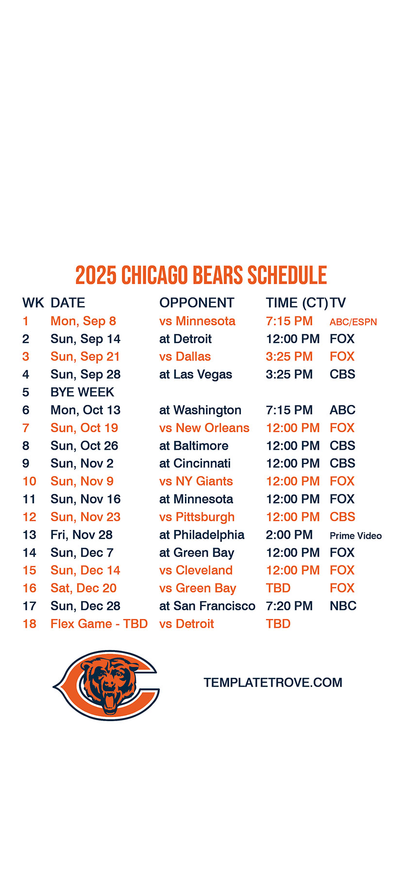Chicago Bears Lock Screen Schedule for iPhone 6, 7, 8 Plus