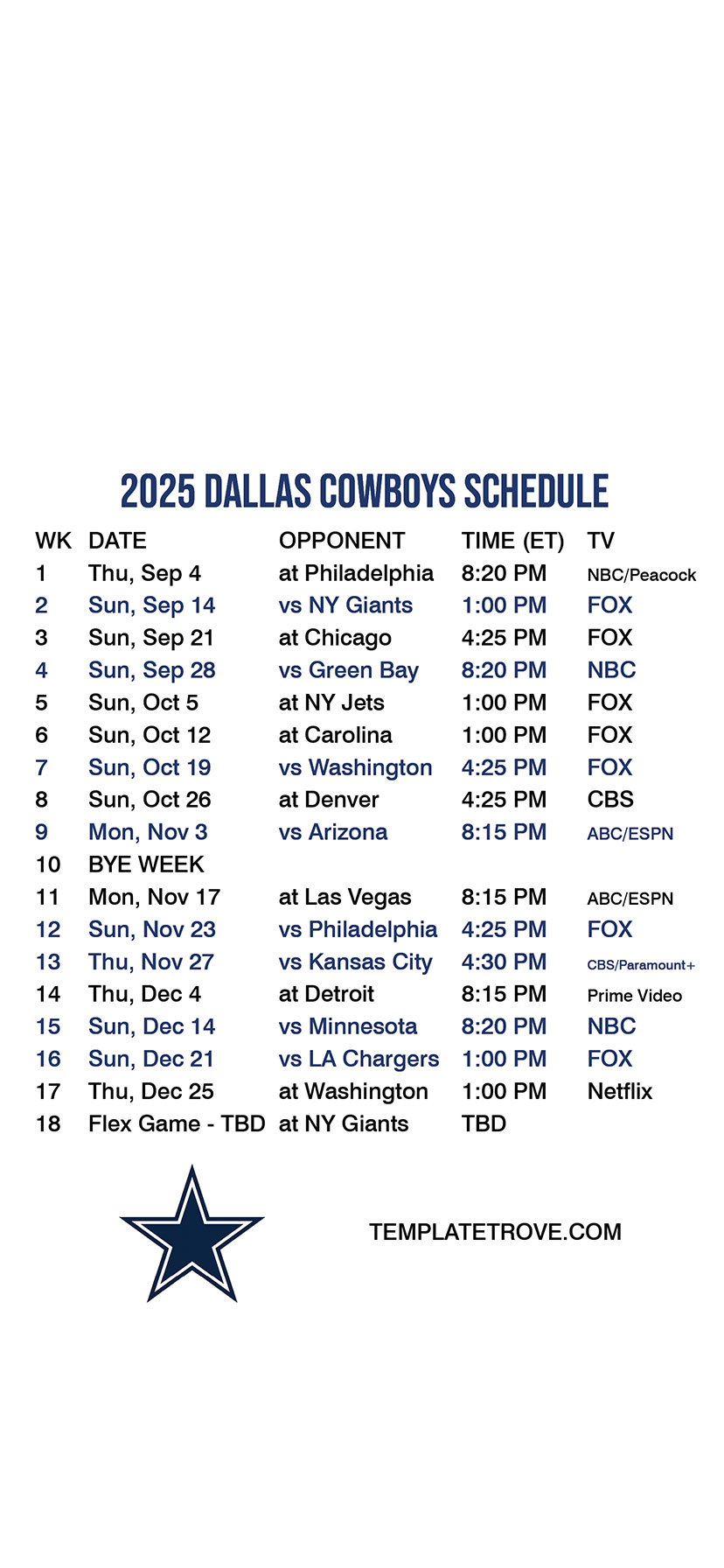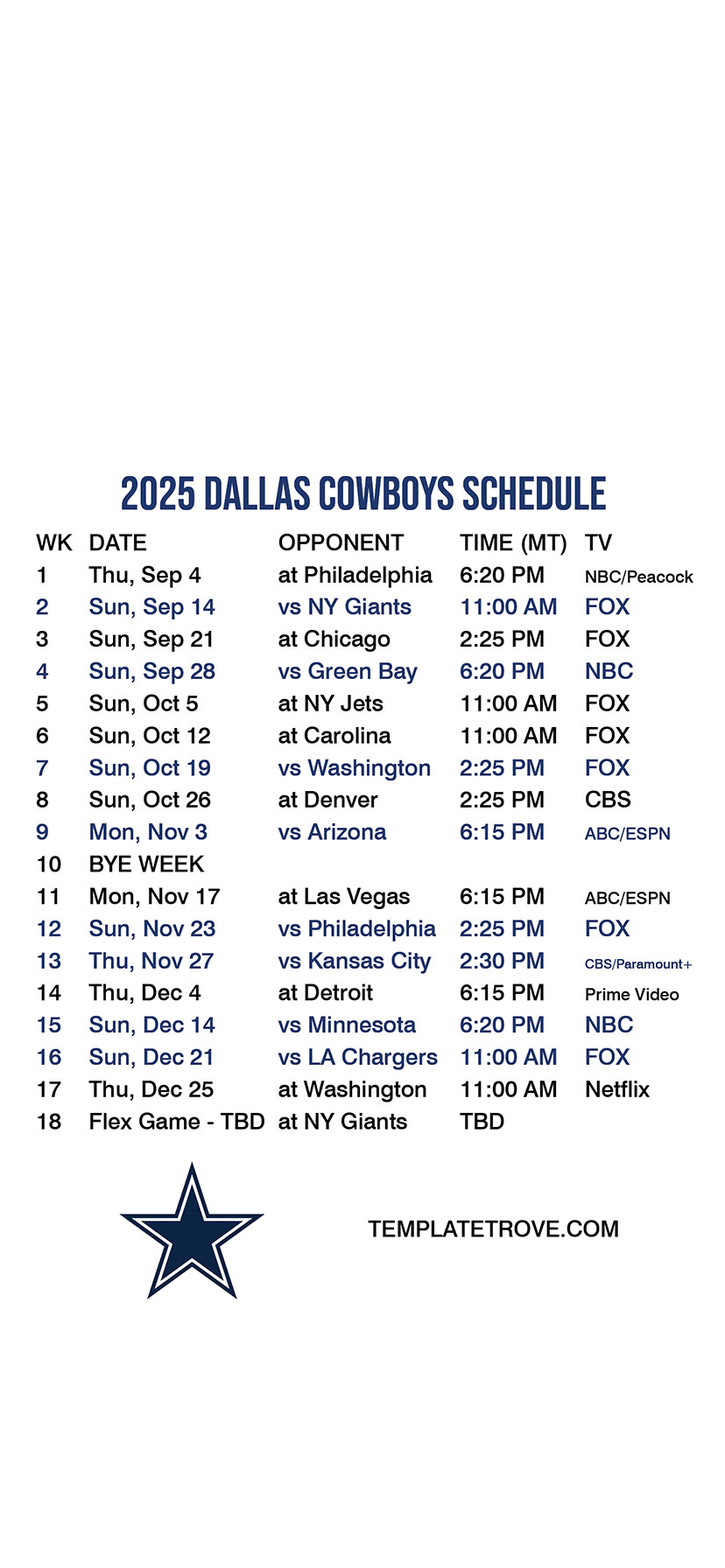 Dallas Cowboys Lock Screen Schedule for iPhone 6, 7, 8 Plus