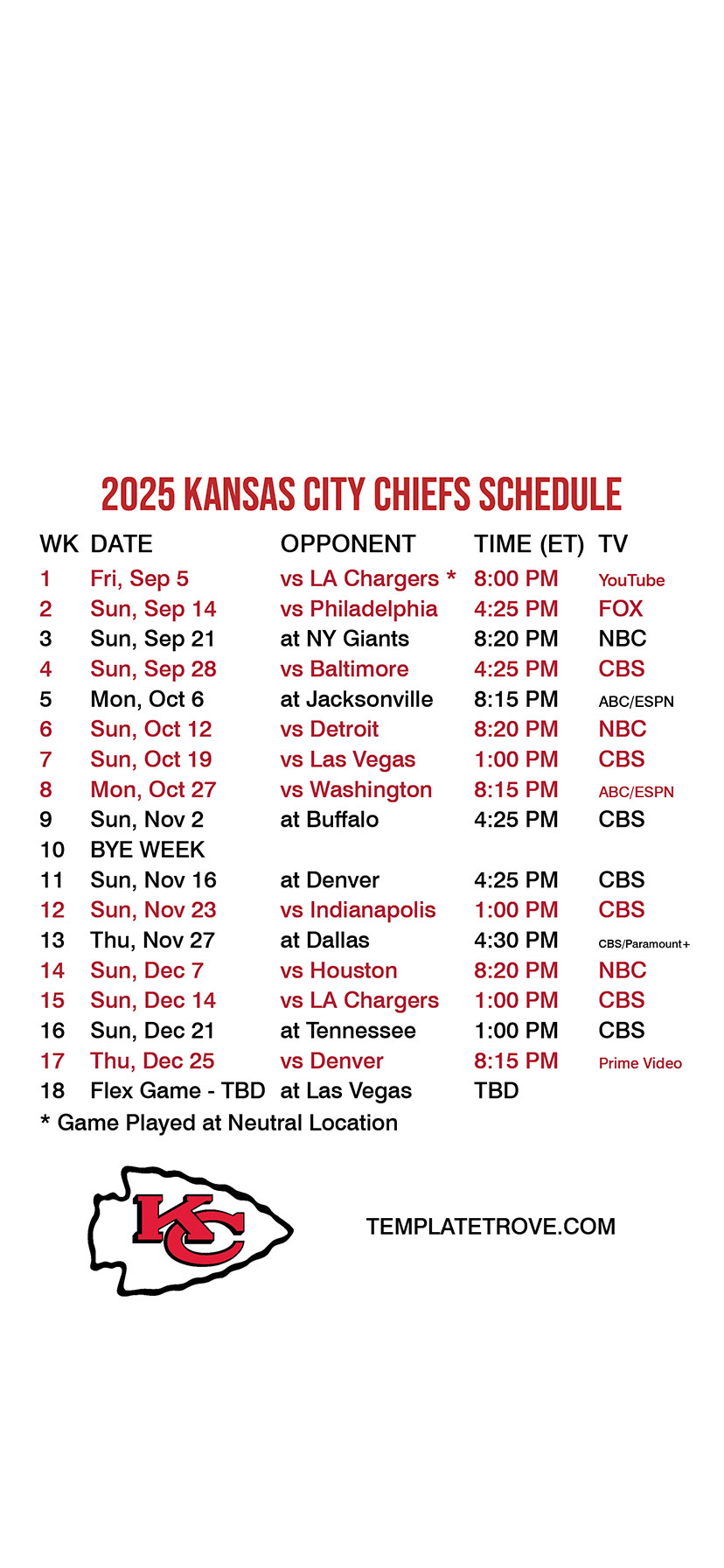 Kansas City Chiefs Lock Screen Schedule for iPhone 6, 7, 8