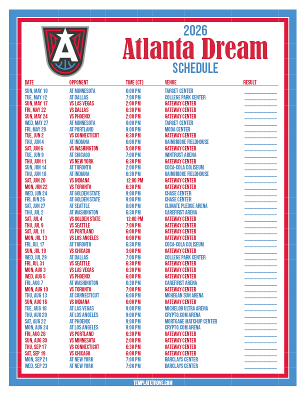 Keep up with the Atlanta Dream basketball team in the 2026 season with our free printable regular season schedules.