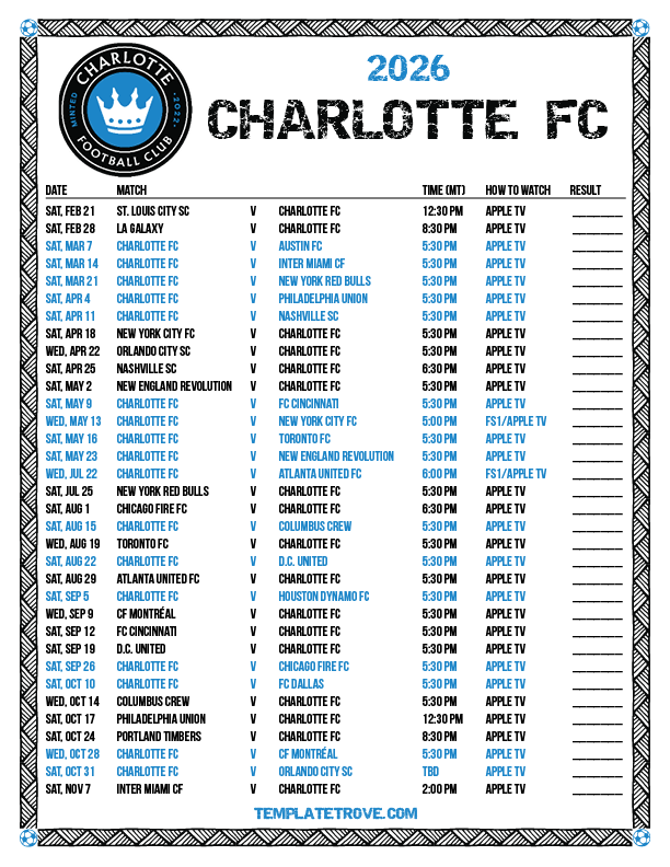 Keep up with the Charlotte FC soccer team in the 2026 season with our free printable regular season schedules.