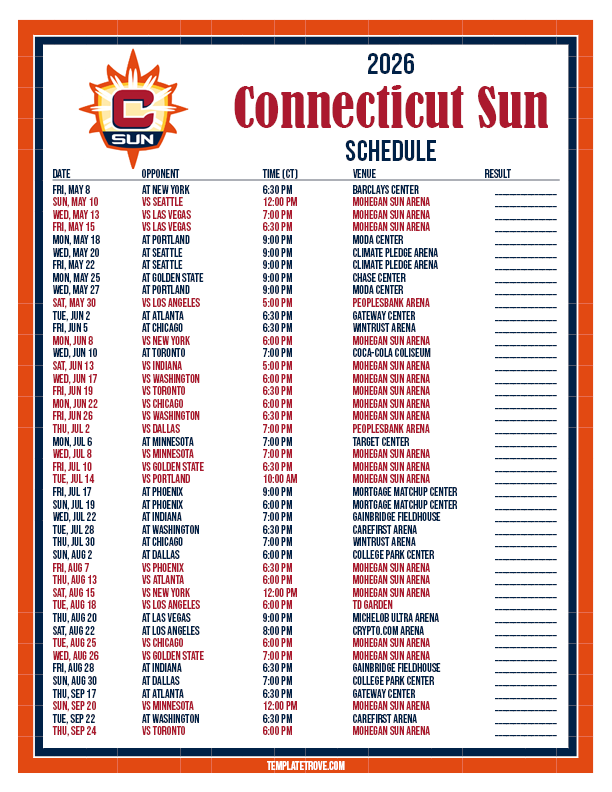Keep up with the Connecticut Sun basketball team in the 2026 season with our free printable regular season schedules.