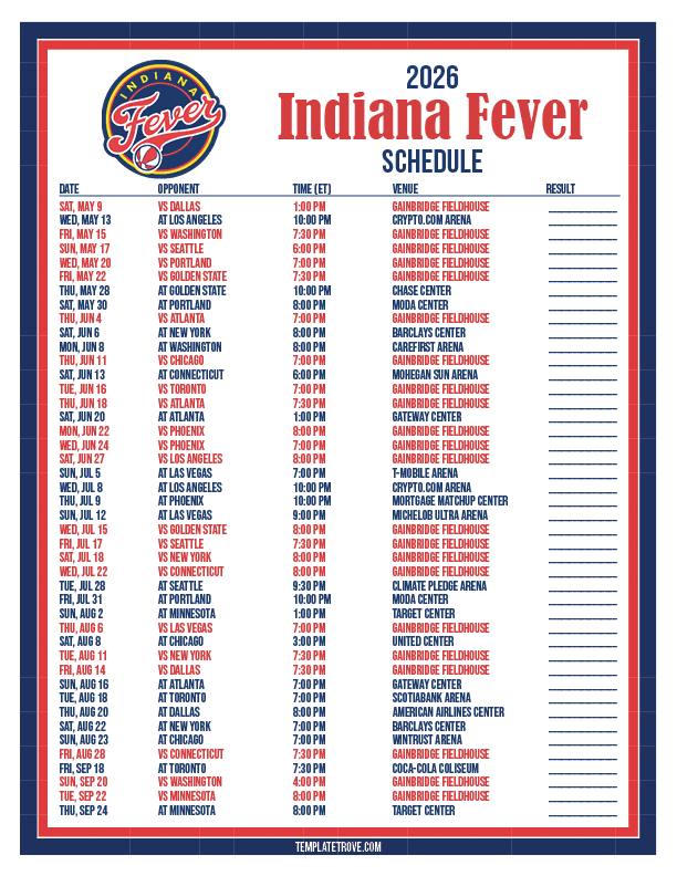Keep up with the Indiana Fever basketball team in the 2026 season with our free printable regular season schedules.