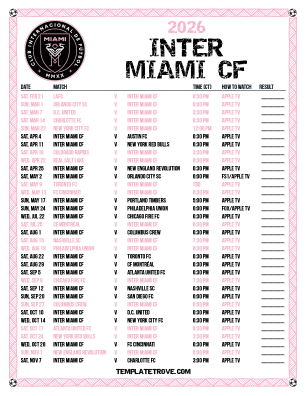 Keep up with the Inter Miami CF soccer team in the 2026 season with our free printable regular season schedules.
