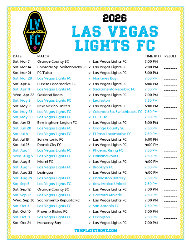 Keep up with the Las Vegas Lights FC soccer team in the 2026 season with our free printable regular season schedules.