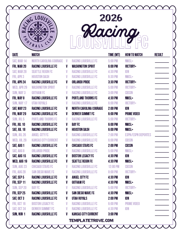 Keep up with the Racing Louisville FC soccer team in the 2026 season with our free printable regular season NWSL schedules.