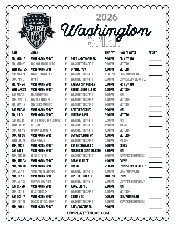 Keep up with the Washington Spirit soccer team in the 2026 season with our free printable regular season NWSL schedules.