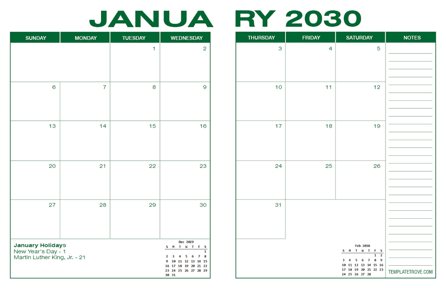 This template prints on standard 8 1/2" x 11" letter size paper and requires two pages for a complete month. The PDF includes both pages for each calendar month.