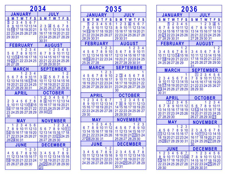 Blue 3 Year Calendar - 2034 - 2035 - 2036