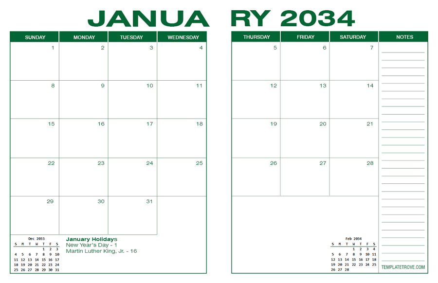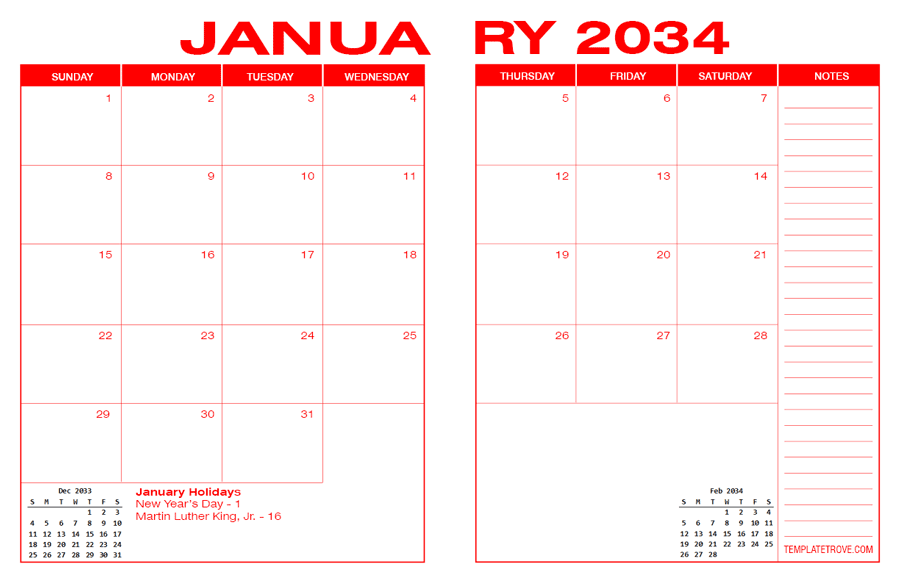 This template prints on standard 8 1/2" x 11" letter size paper and requires two pages for a complete month. The PDF includes both pages for each calendar month.