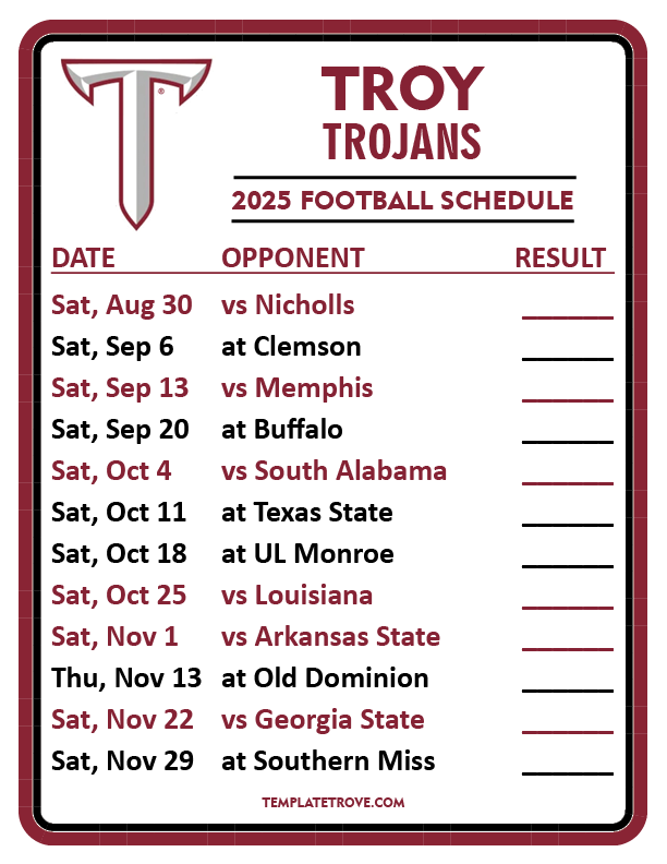 If you get a chance, please share the schedules through social media with your fellow Troy Fans. It's easy, and it would help us out a bunch, just click one of the social share buttons at the right of the screen on desktop or the black share button at the bottom right on mobile phones.