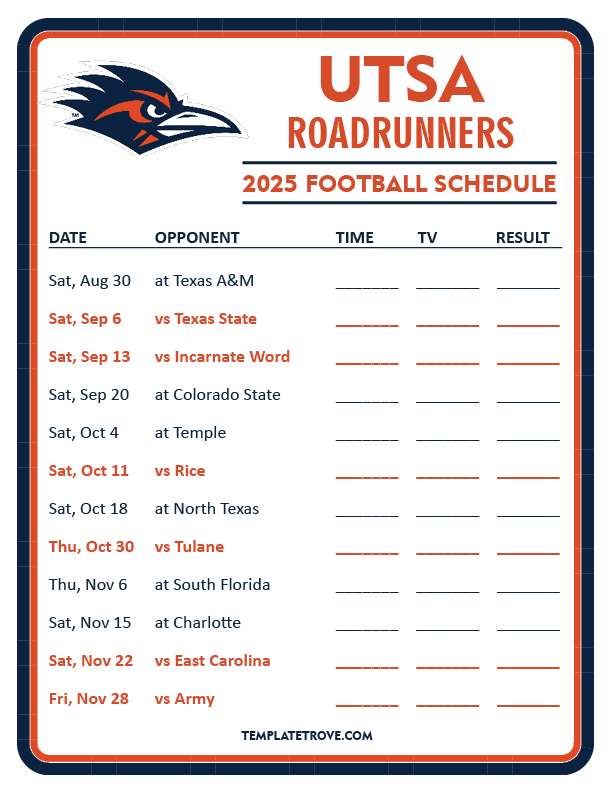 Style 3 - dates and opponents with columns to write in game times, TV network and results
