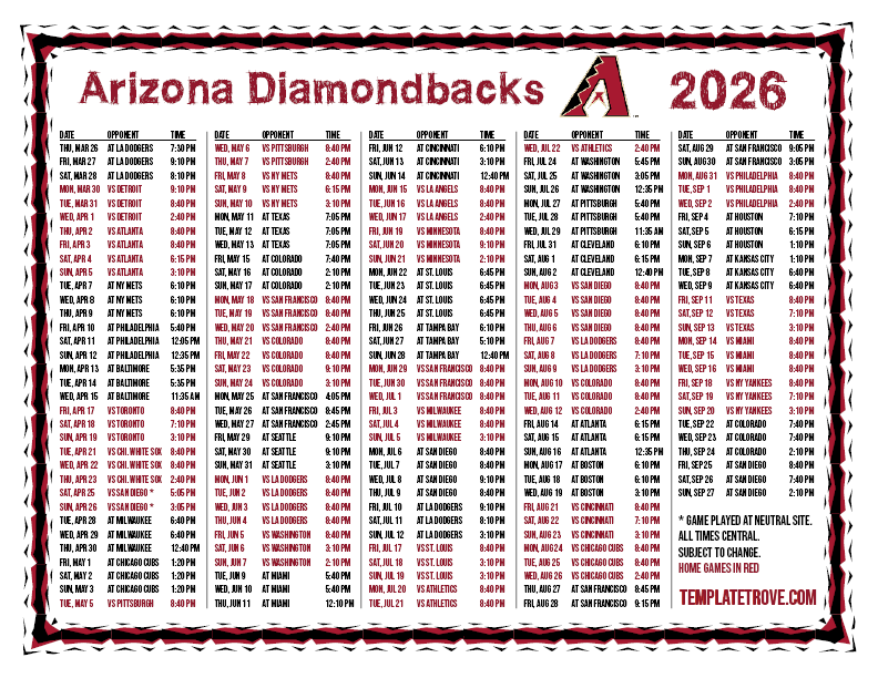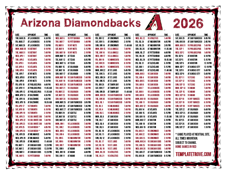 Keep up with the 2026 Arizona Diamondbacks with our handy printable schedules, now available for each US time zone.