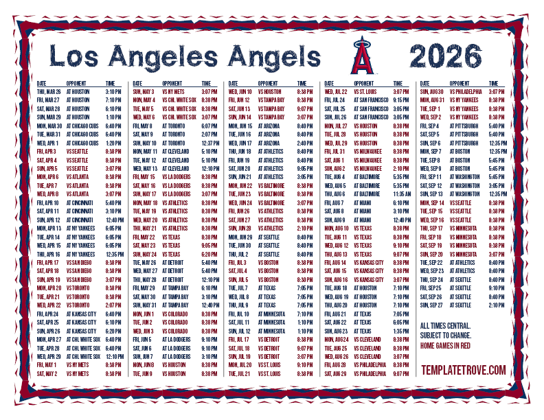 Keep up with the 2026 Los Angeles Angels with our handy printable schedules, now available for each US time zone.
