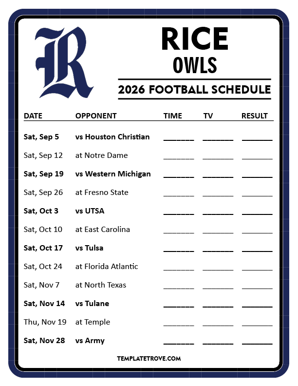 Style 3 - dates and opponents with columns to write in game times, TV network and results