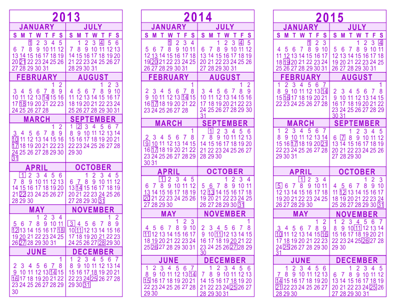 Purple 3 Year Calendar - 2013 - 2014 - 2015