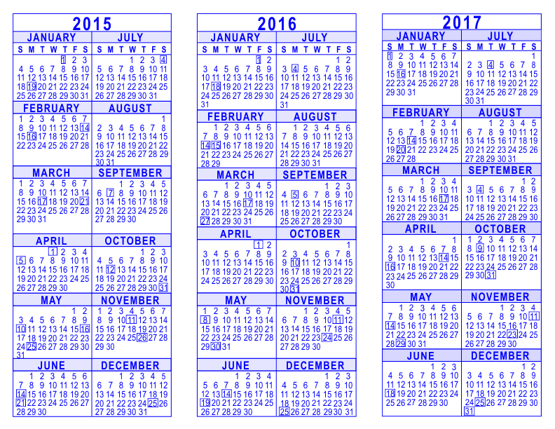 Blue 3 Year Calendar - 2015 - 2016 - 2017