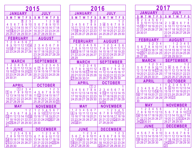 Purple 3 Year Calendar - 2015 - 2016 - 2017
