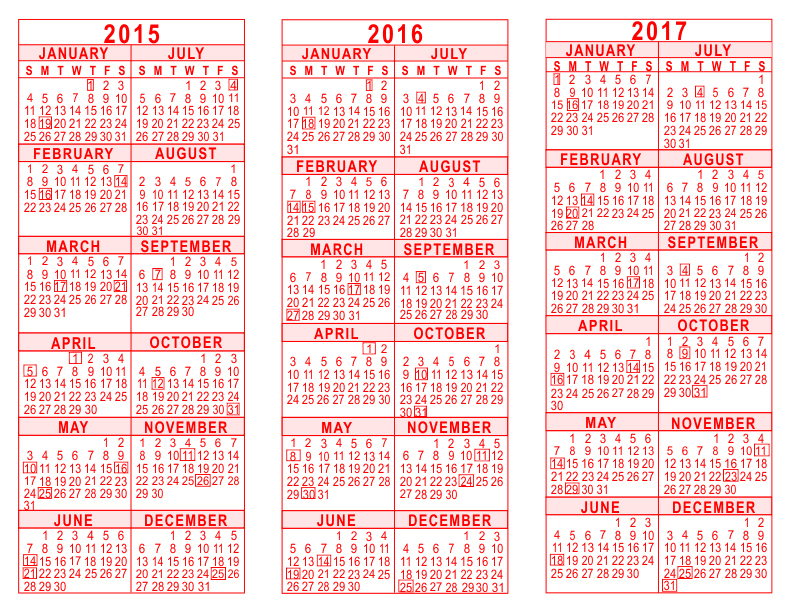 3 year calendars are available in PDF format. Five colors to choose from and can be printed on standard letter size paper (8 1/2" x 11").