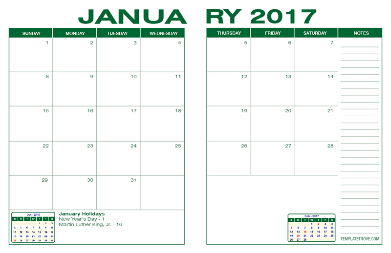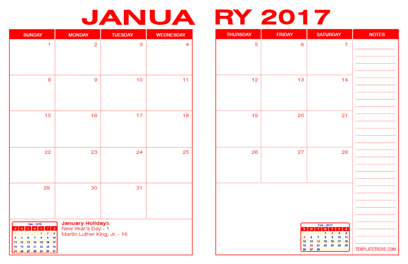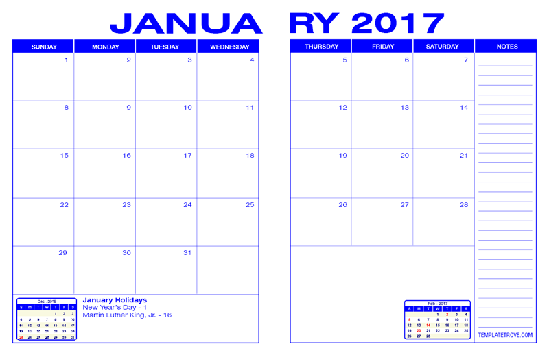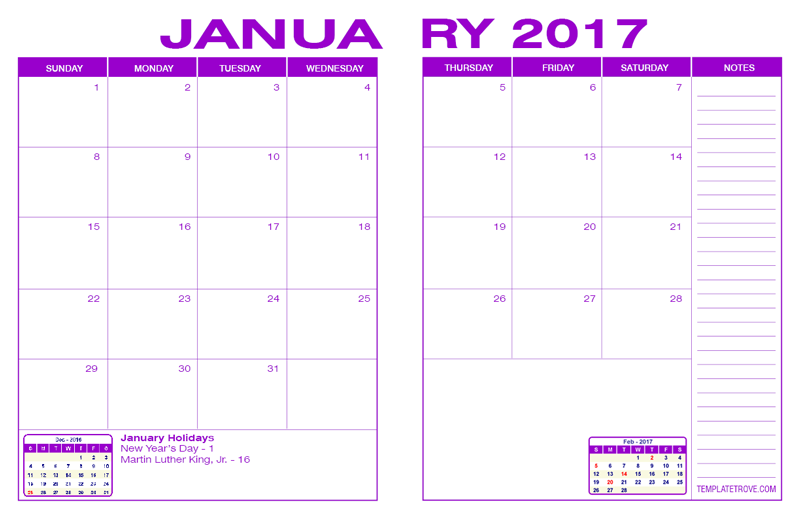 This template prints on standard 8 1/2" x 11" letter size paper and requires two pages for a complete month. The PDF includes both pages for each calendar month.