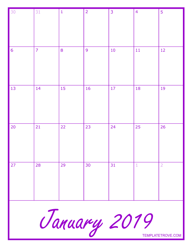 2019 Blank Monthly Calendar - Purple