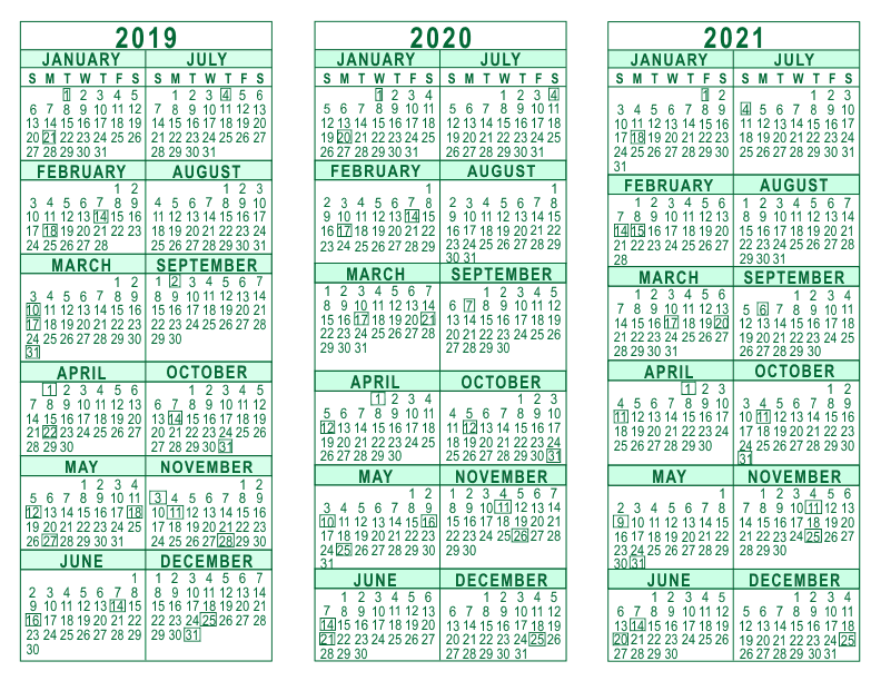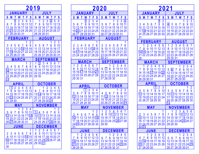 Blue 3 Year Calendar - 2019 - 2020 - 2021