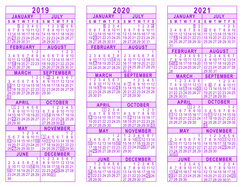 Purple 3 Year Calendar - 2019 - 2020 - 2021