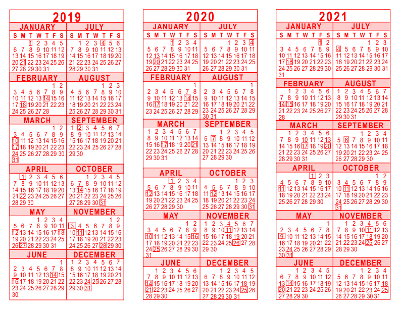 3 year calendars are available in PDF format. Five colors to choose from and can be printed on standard letter size paper (8 1/2" x 11").