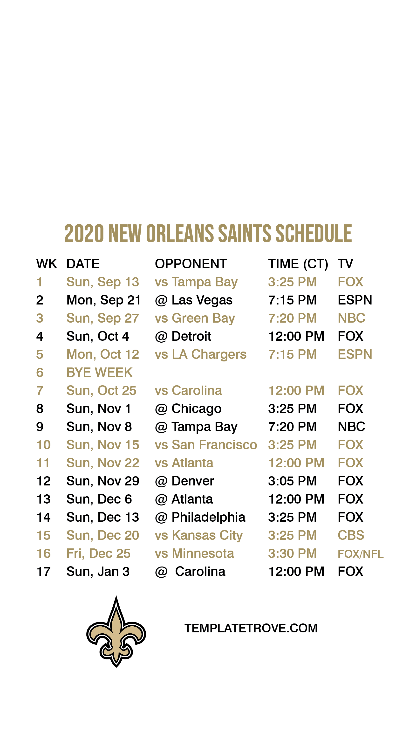 2020-21 New Orleans Saints Lock Screen Schedule