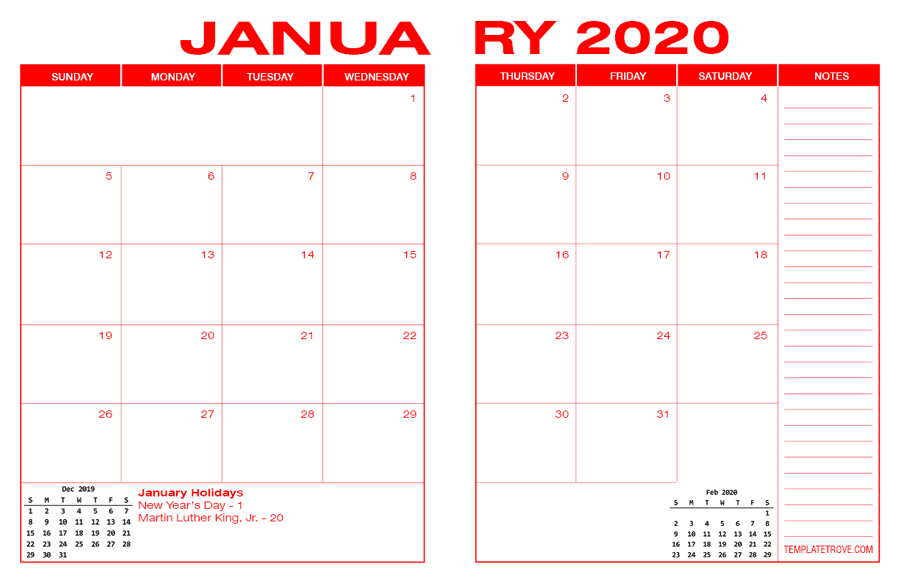 This template prints on standard 8 1/2" x 11" letter size paper and requires two pages for a complete month. The PDF includes both pages for each calendar month.