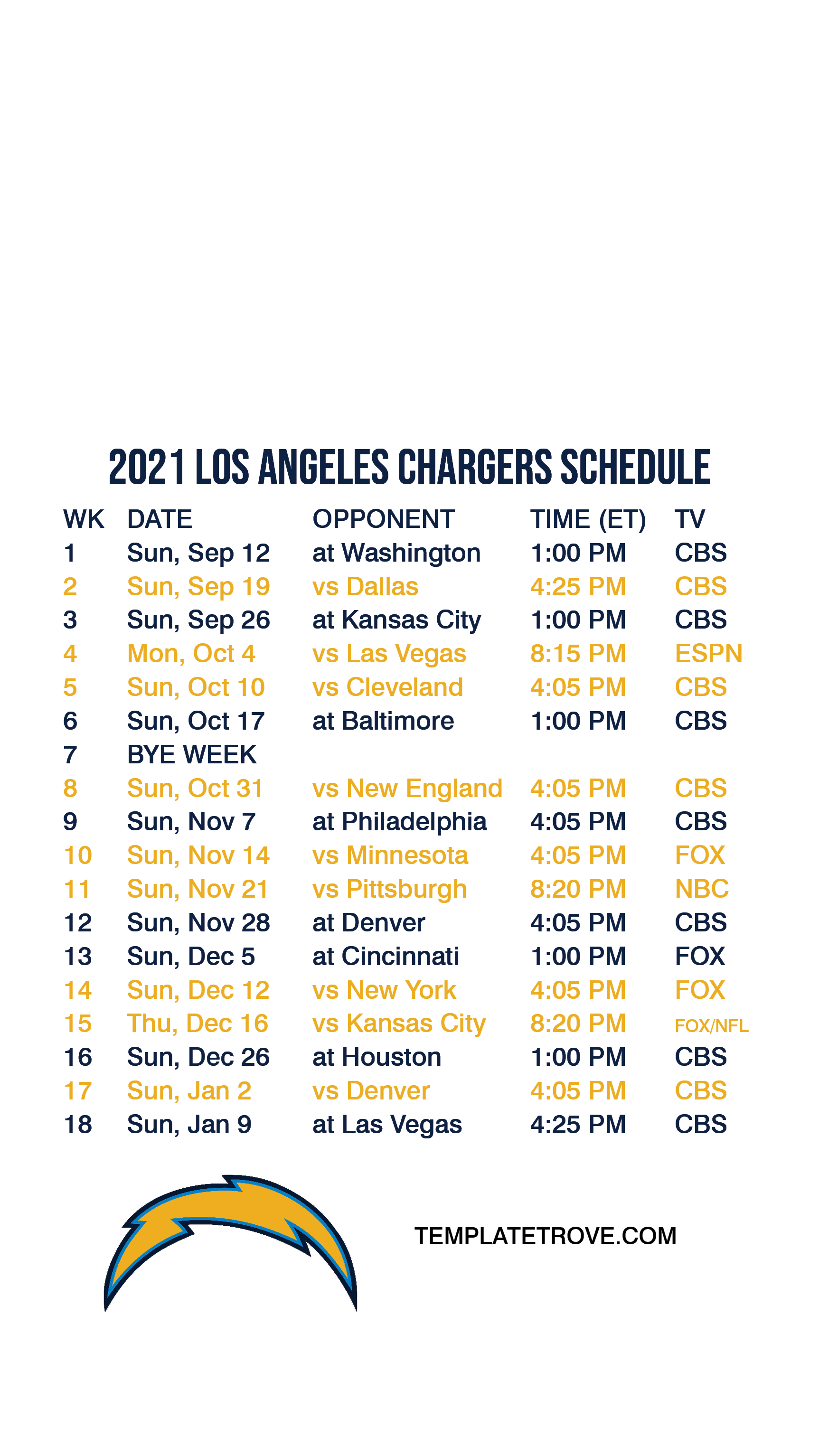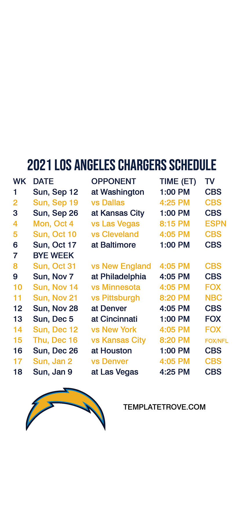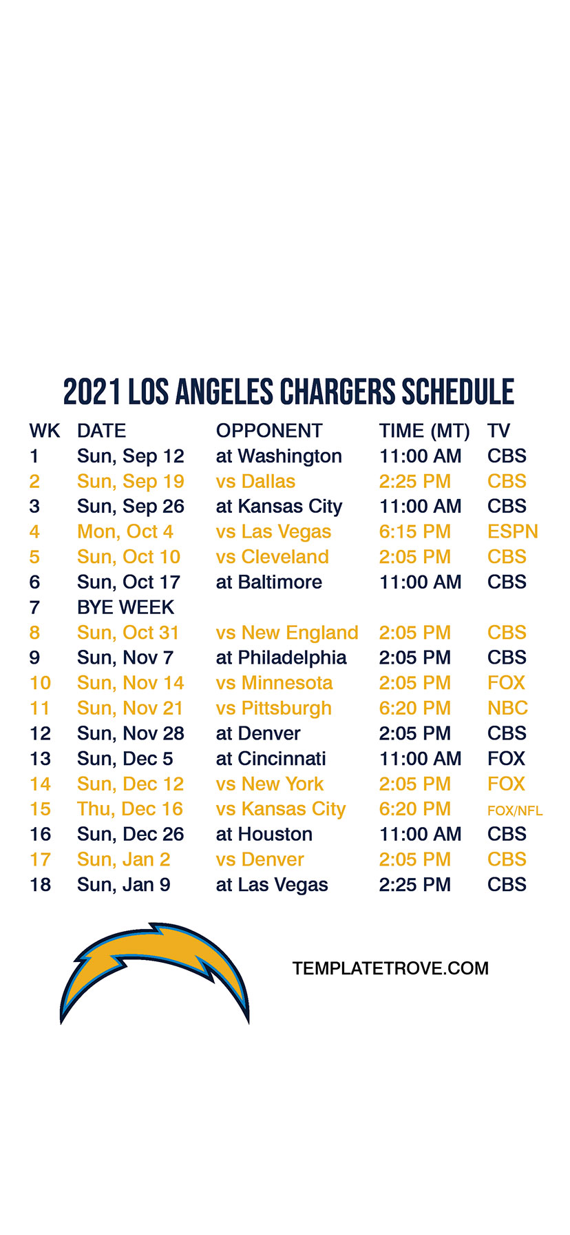 2021-22 Los Angeles Chargers Lock Screen Schedule