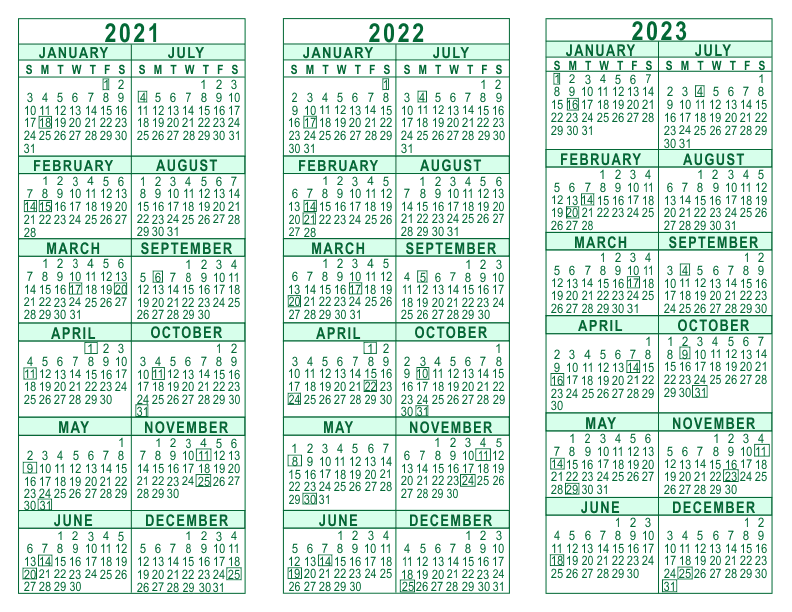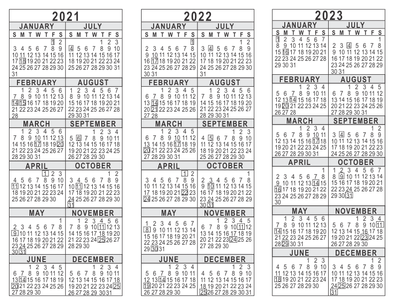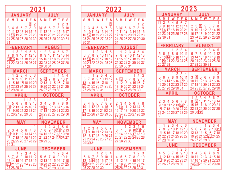 3 year calendars are available in PDF format. Five colors to choose from and can be printed on standard letter size paper (8 1/2" x 11").