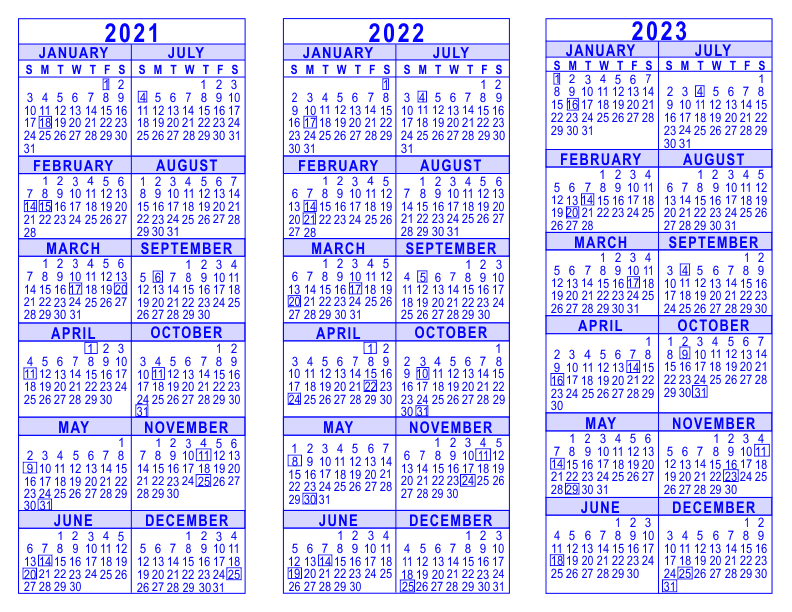 Blue 3 Year Calendar - 2020 - 2021 - 2022
