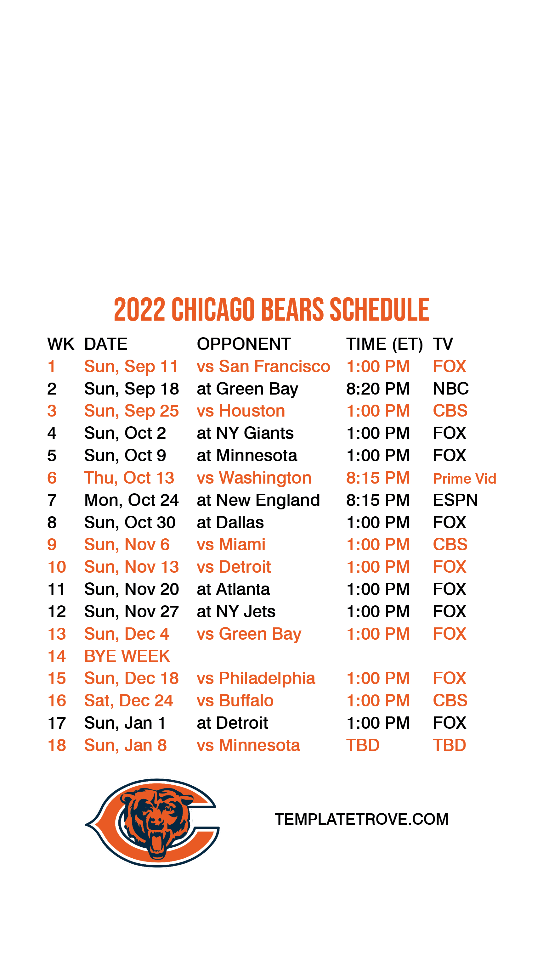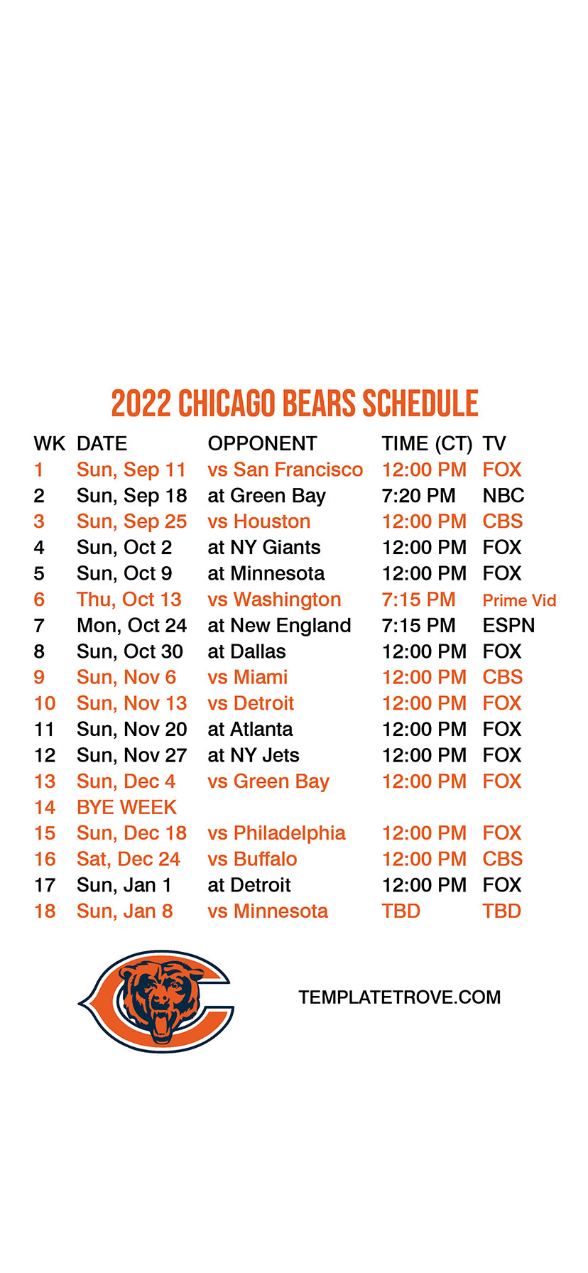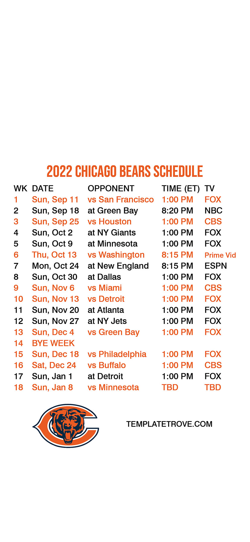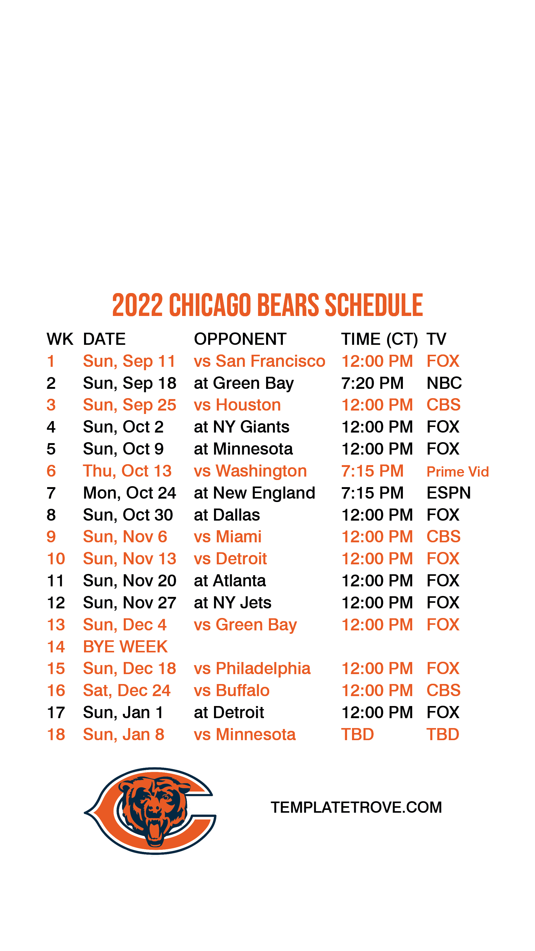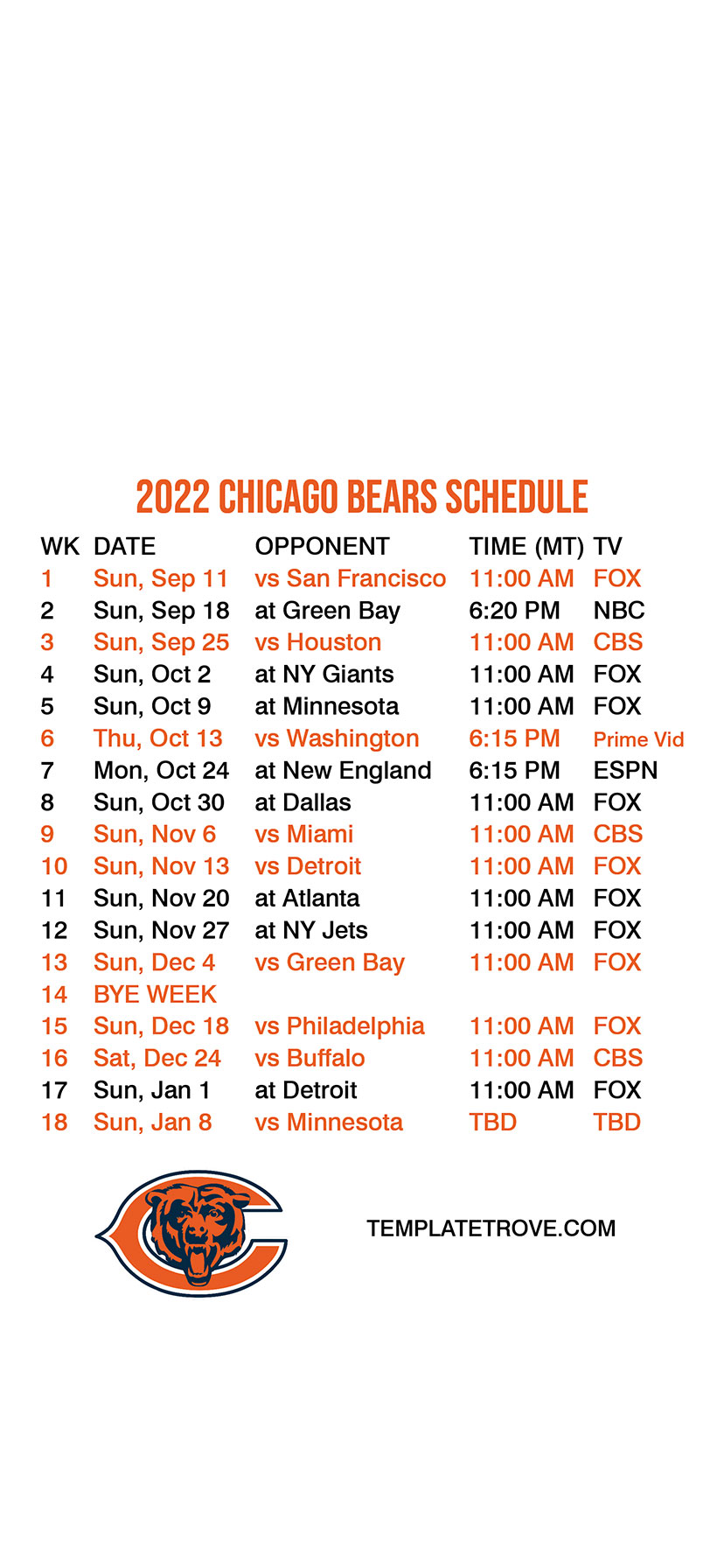 Chicago Bears Lock Screen Schedule for iPhone 6, 7, 8 Plus
