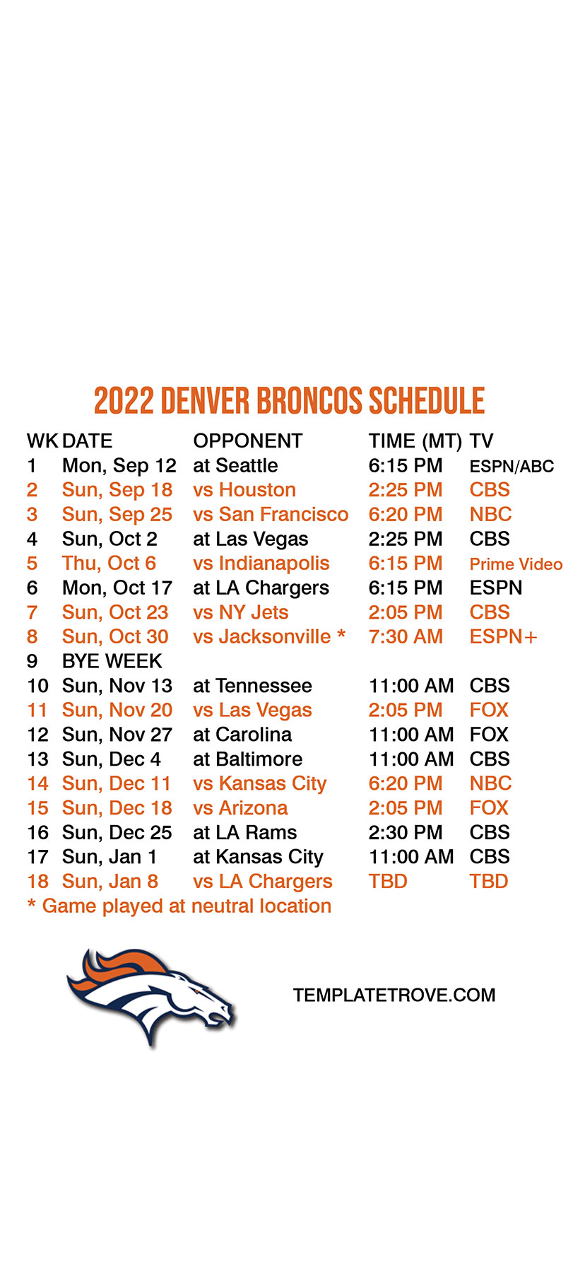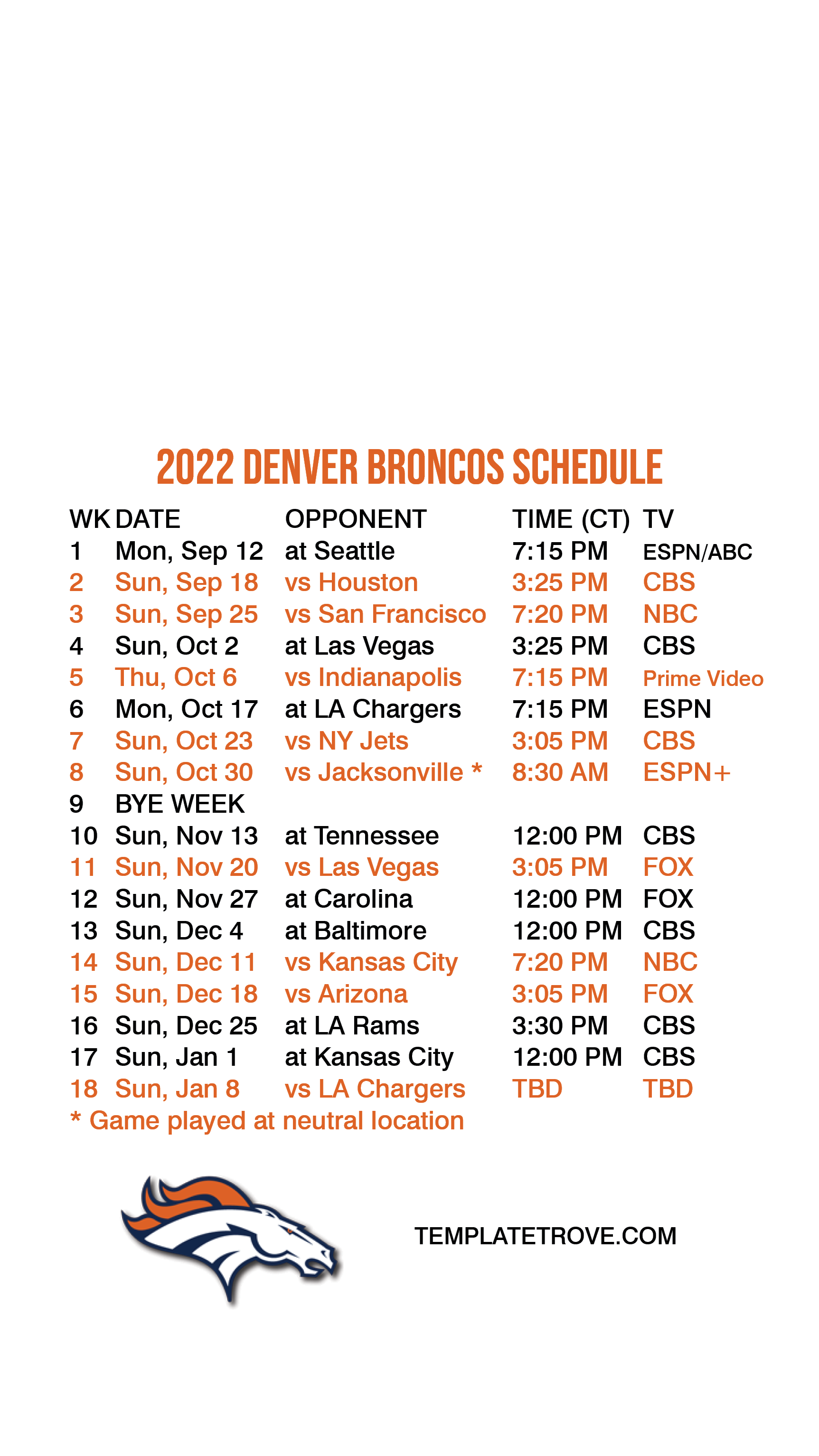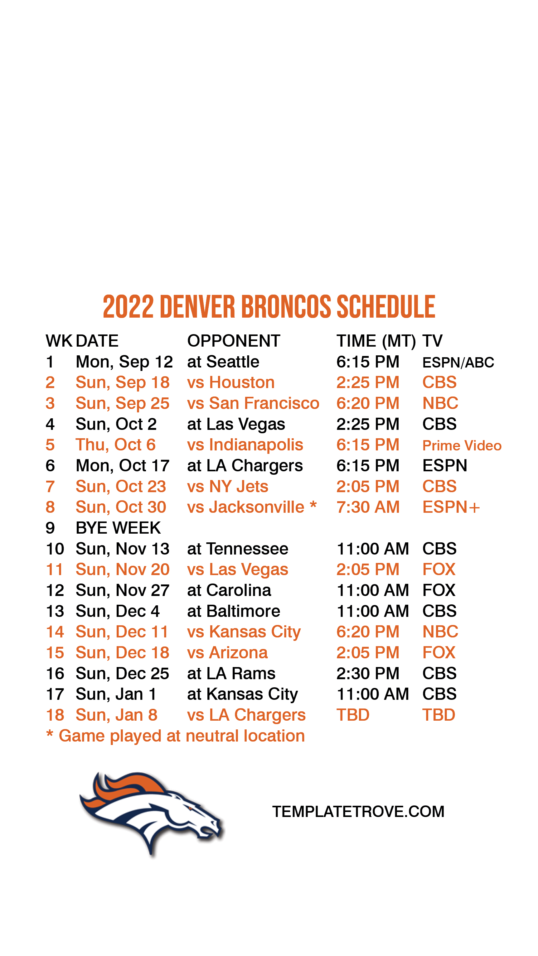 Denver Broncos Lock Screen Schedule for iPhone 6, 7, 8 Plus