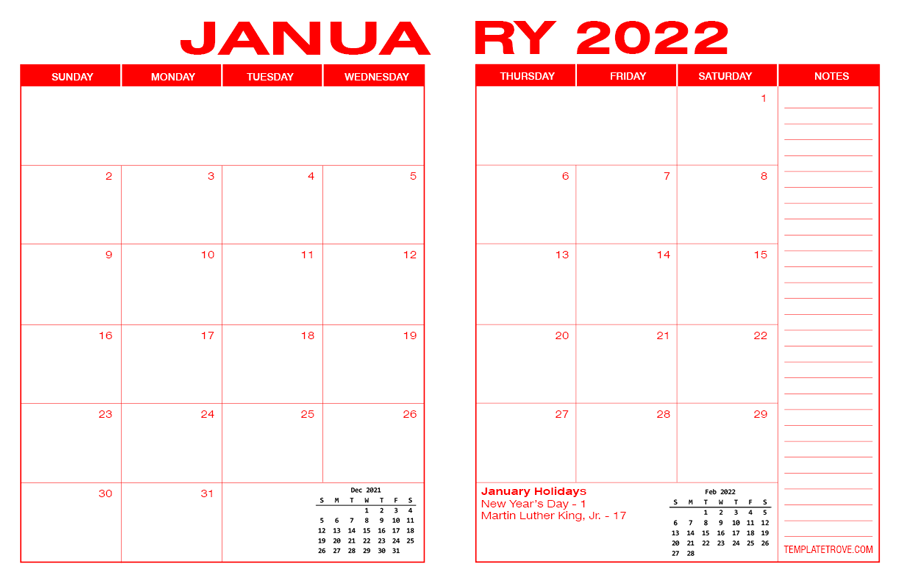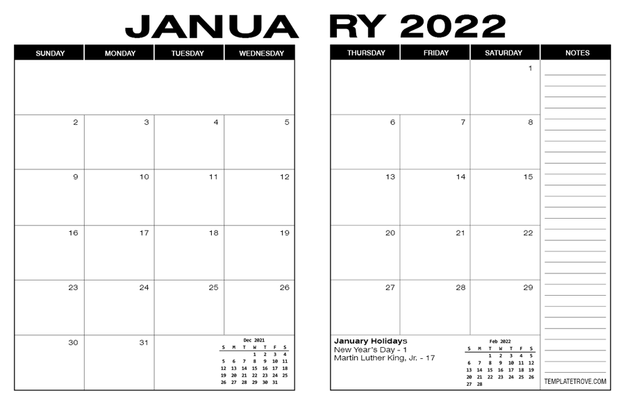 This template prints on standard 8 1/2" x 11" letter size paper and requires two pages for a complete month. The PDF includes both pages for each calendar month.