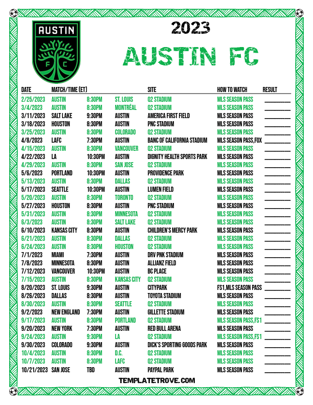 Keep up with the Austin FC soccer team in the 2023 season with our free printable regular season schedules.