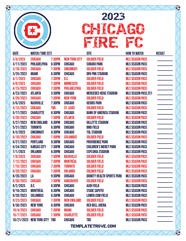 Keep up with the Chicago Fire FC soccer team in the 2023 season with our free printable regular season schedules.