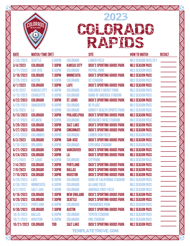 Keep up with the Colorado Rapids soccer team in the 2023 season with our free printable regular season schedules.