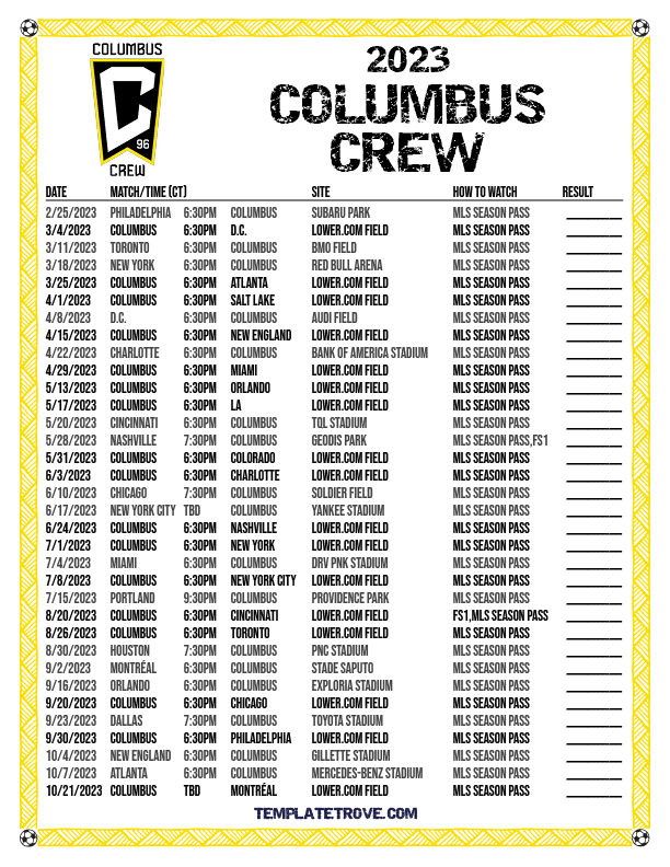 Keep up with the Columbus Crew soccer team in the 2023 season with our free printable regular season schedules.