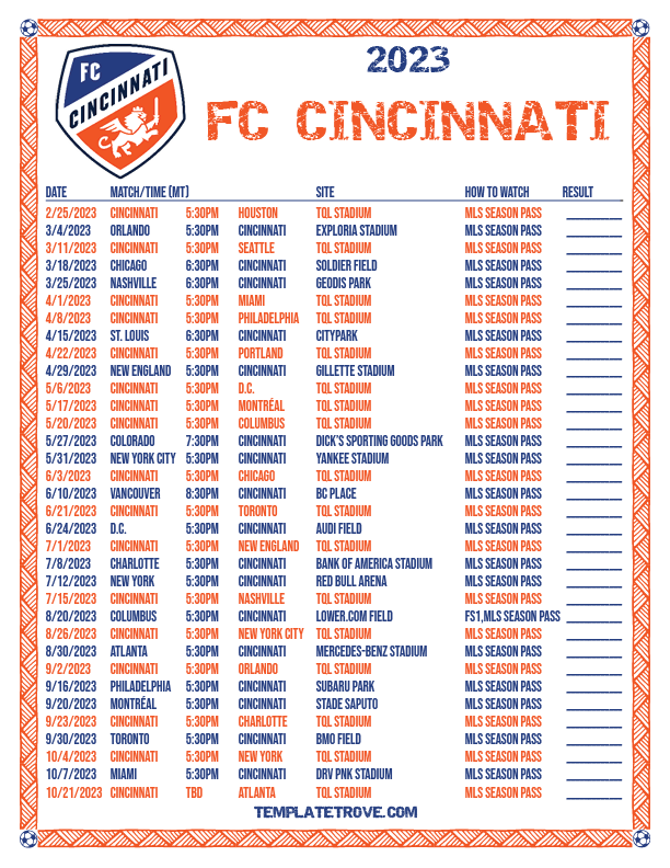 Keep up with the FC Cincinnati soccer team in the 2023 season with our free printable regular season schedules.