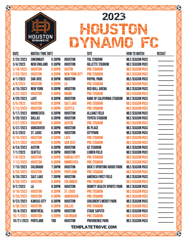Keep up with the Houston Dynamo FC soccer team in the 2023 season with our free printable regular season schedules.