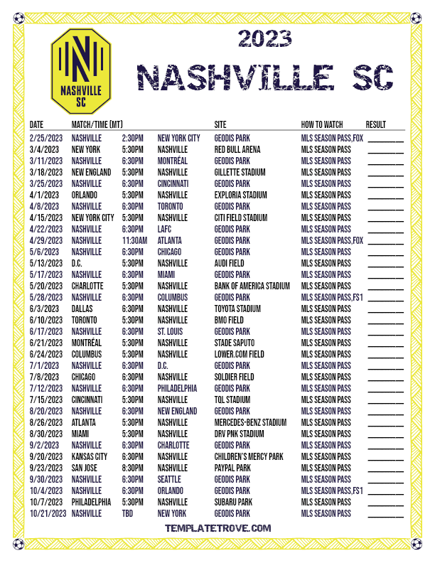 Keep up with the Nashville SC soccer team in the 2023 season with our free printable regular season schedules.