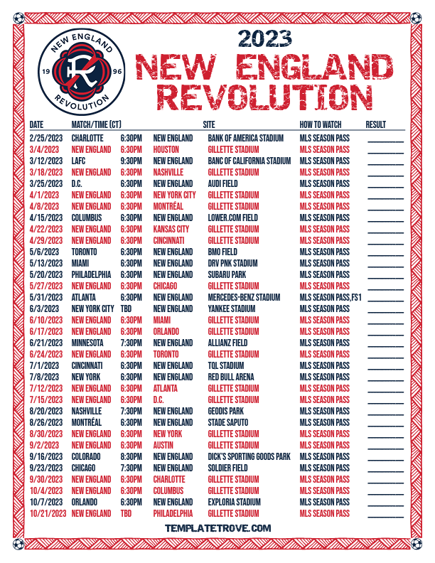 Keep up with the New England Revolution soccer team in the 2023 season with our free printable regular season schedules.