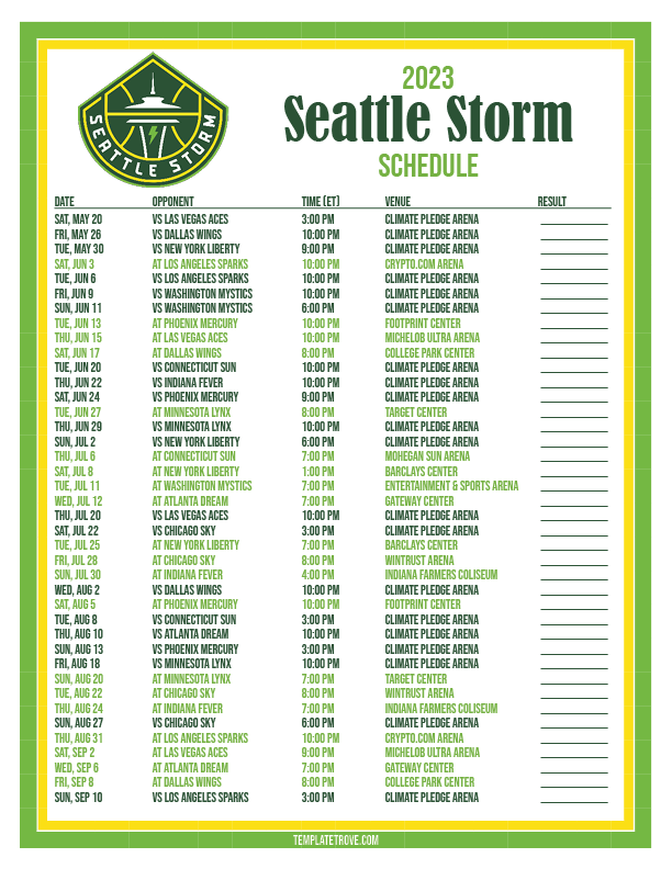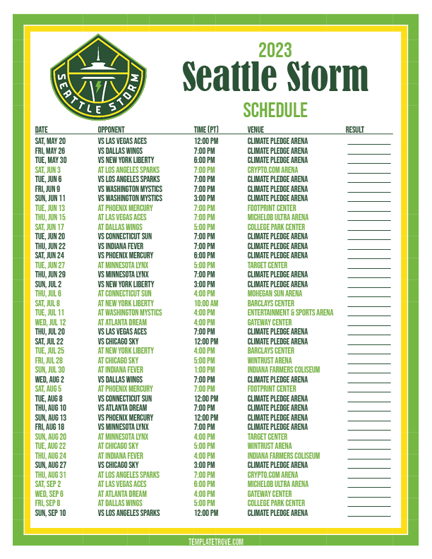 Keep up with the Seattle Storm basketball team in the 2023 season with our free printable regular season schedules.