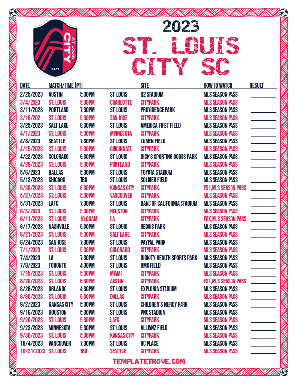 Keep up with the St Louis City SC soccer team in the 2023 season with our free printable regular season schedules.
