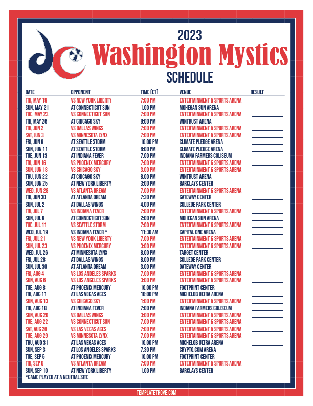 Keep up with the Washington Mystics basketball team in the 2023 season with our free printable regular season schedules.