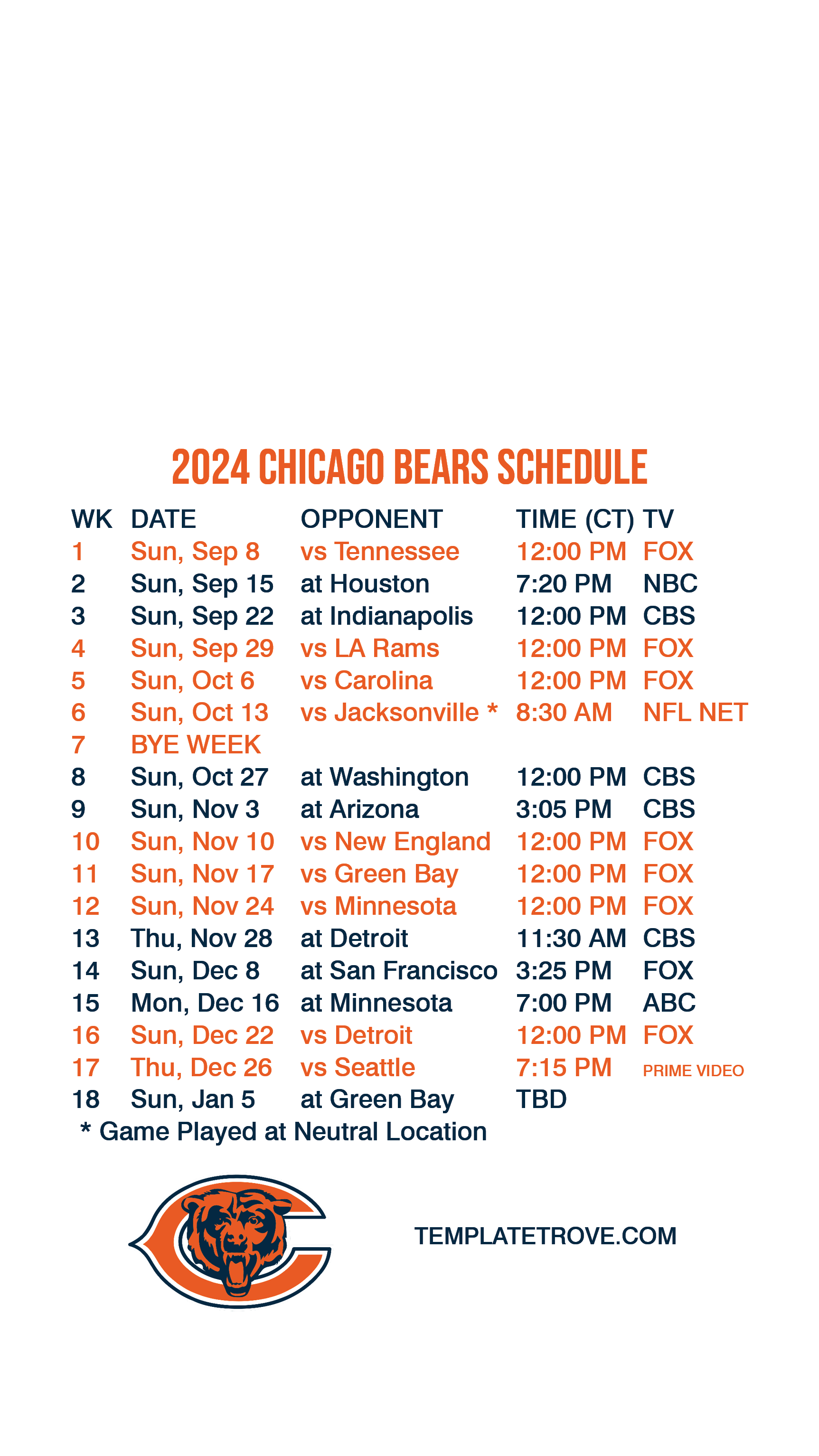 Chicago Bears Lock Screen Schedule for iPhone 6, 7, 8 Plus