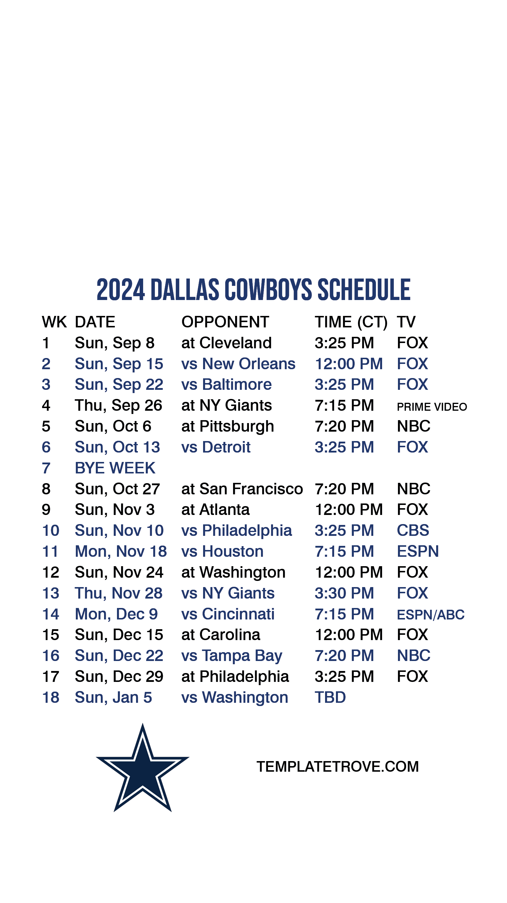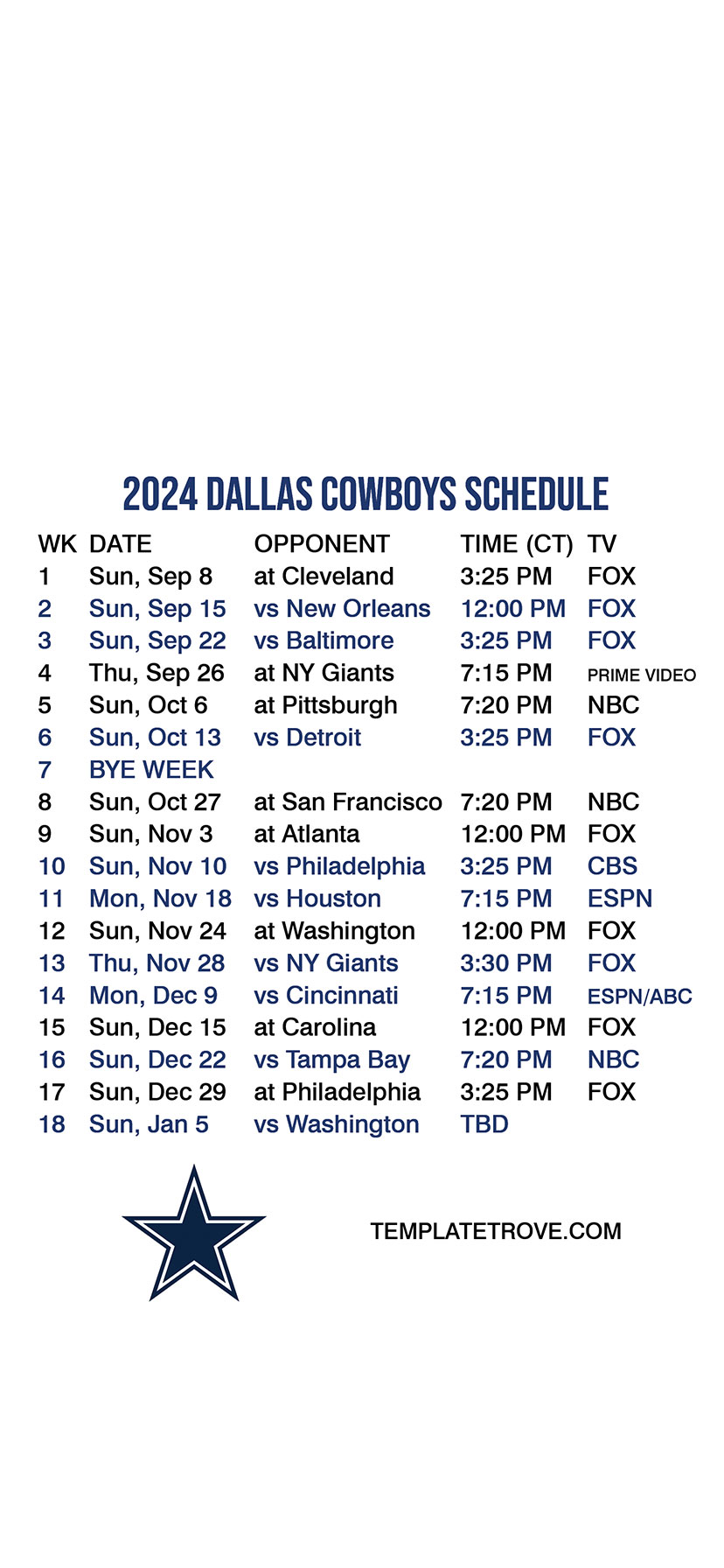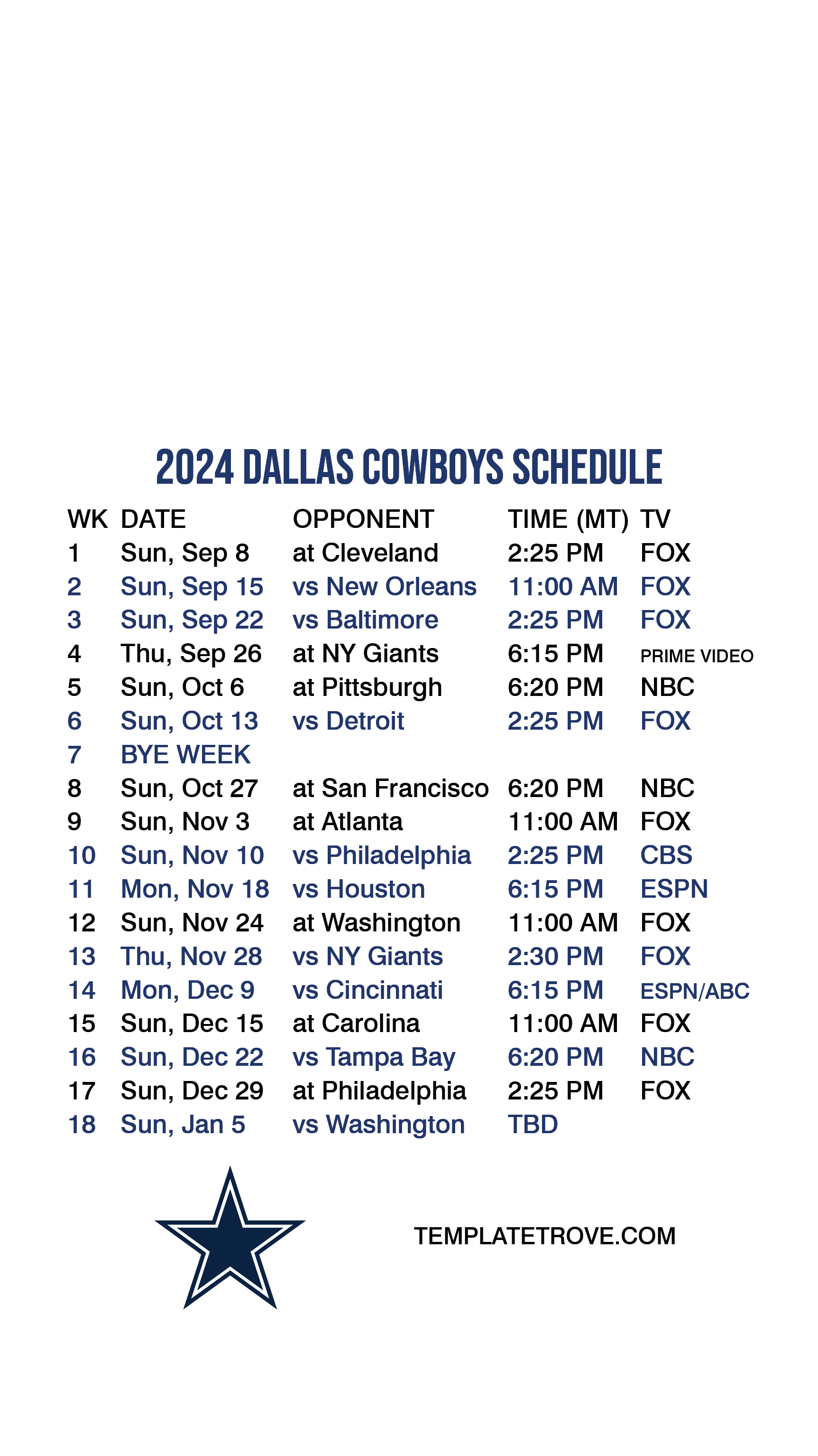Dallas Cowboys Lock Screen Schedule for iPhone 6, 7, 8 Plus