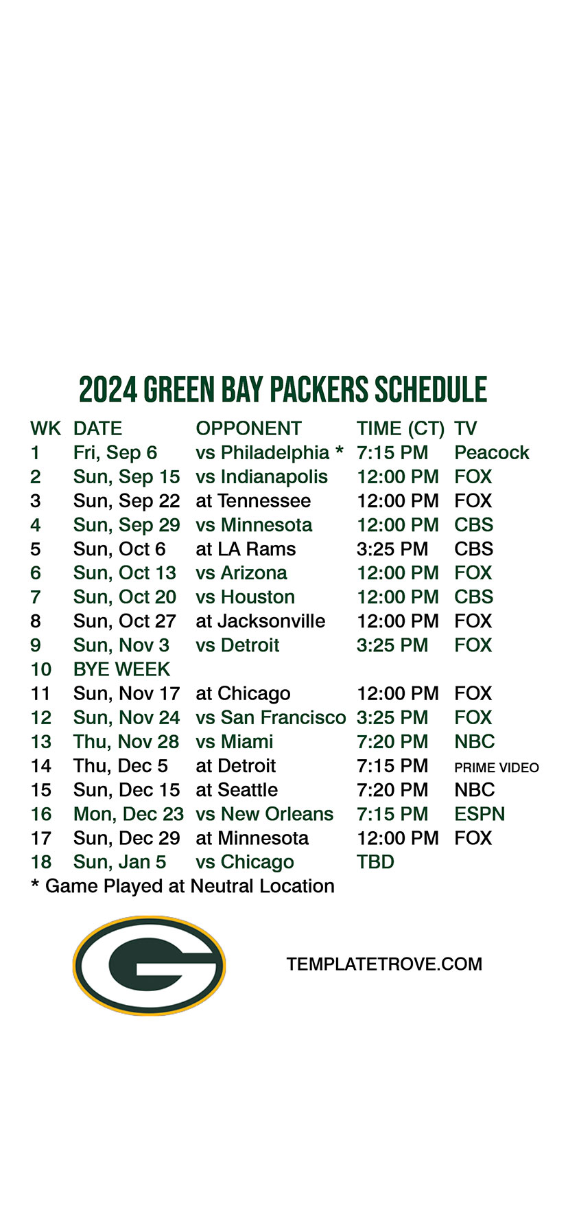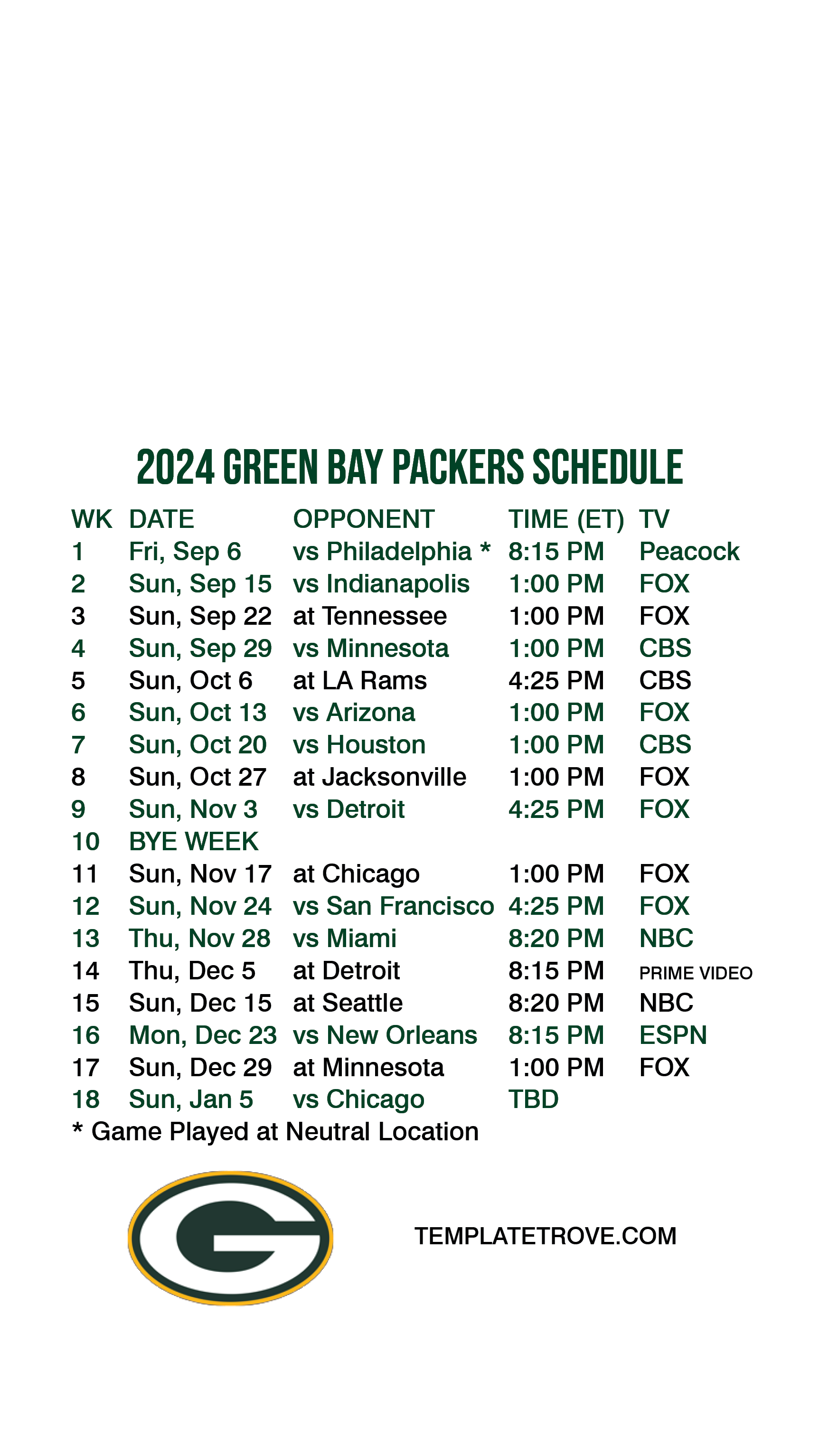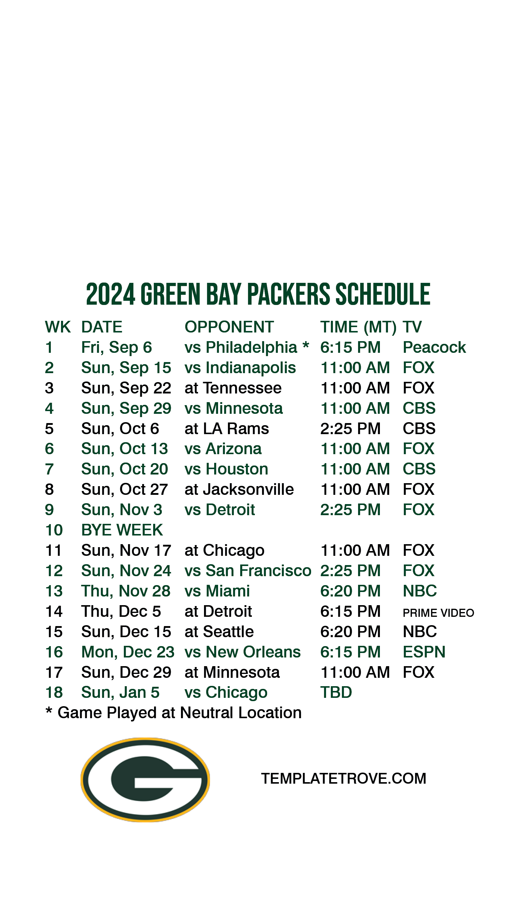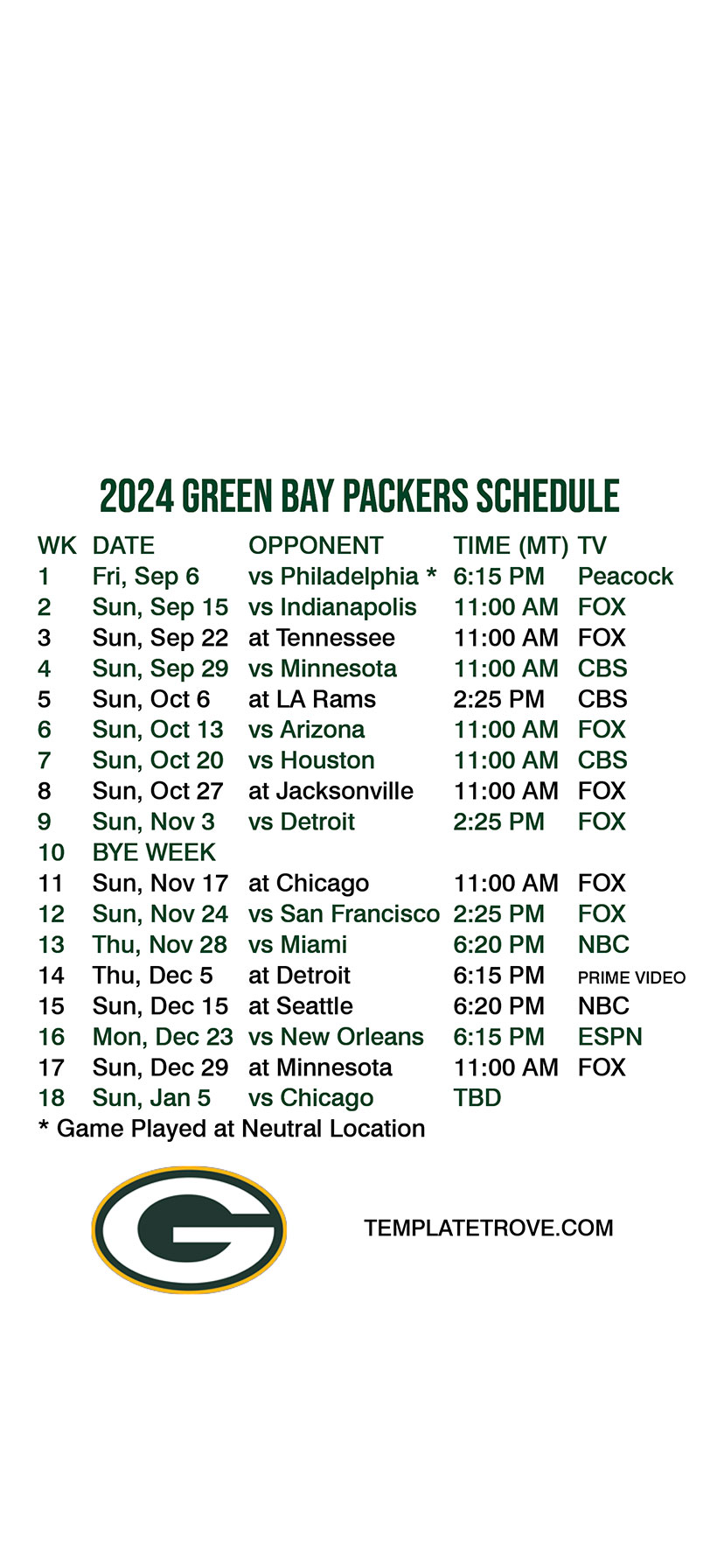 Green Bay Packers Lock Screen Schedule for iPhone 6, 7, 8